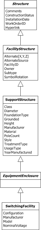 SwitchingFacility inherits characteristics from the abstract classes Structure, FacilityStructure, and EquipmentEnclosure. Any model names assigned to these classes should be assigned to SwitchingFacility as well.