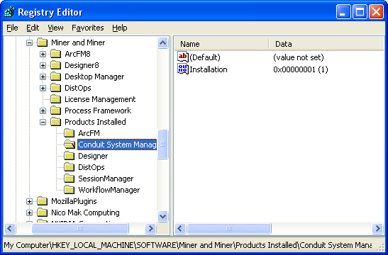 In the Registry Editor, navigate to the following folder: HKEY_LOCAL_MACHINE\SOFTWARE\Miner and Miner\Products Installed. In this folder you should see all of the ArcFM products that you currently have installed.