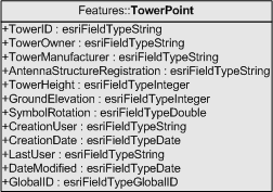 Attributes (required fields in red): TowerID: text - This field stores the unique company assigned number that identifies the tower. TowerOwner: text - This field denotes who owns the tower asset, but not necessarily the antenna attached to it. TowerManufacturer: text - This is the company that built the tower. This information is useful if a warranty exists or parts must be replaced on the tower. AntennaStructureRegistration: text - This is the registration number that is filed with the Federal Communications Commission (FCC) for any antenna structure more than 200 feet tall or located near an airport. TowerHeight: long integer - This is the total height of the antenna structure measured from its base to the top of the structure. GroundElevation: long integer - This is the elevation of the base of the antenna as measured in feet (in the US) above sea level. This can be represented as meters above sea level in other countries or even with certain organizations in the US. GlobalID: GlobalID - This field contains a unique number (GUID) that is generated and maintained by ArcGIS. This value is used for all relationships in the ArcFM data model and is required for Fiber Manager to function properly.