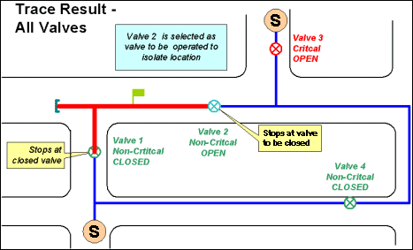 The purpose of the Valve Isolation trace task is to identify valves that need to be operated (closed) to prevent flow of water to a particular location. Anticipated uses are to determine valves to be operated to prevent continued flow in the event of a water leak, or valves to be operated to accomplish a scheduled outage in a designated location.