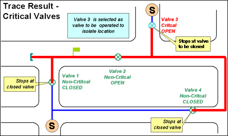 This trace considers only those valves that lie between the isolation point (the user-defined edge flag) and a water source – such as a treatment plant or pump station. Valves that lie downstream of the isolation point are not included in the results.