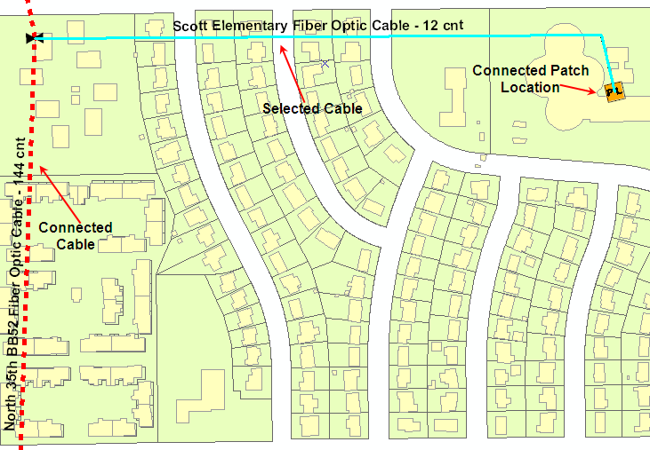 The following map depicts the selection of one cable—the Scott Elementary fiber optic cable. As you can see on the map, the cable is connected to a patch panel and a splice point connecting the North 35th BB52 fiber optic cable.