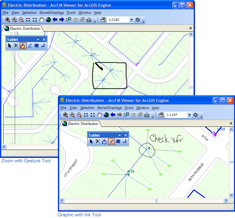 While you may use the Ink tool in ArcFM Viewer for ArcGIS Engine, you must have the Redliner extension or the Inspector extension in order to save these redline marks to a session. Otherwise, they will not be saved. Gestures are supported on a tablet PC both with and without the Redliner or Inspector extensions.