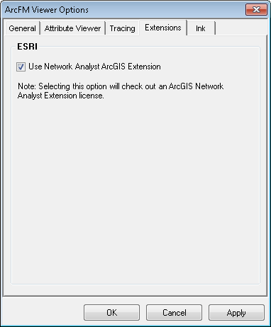| ArcFM Engine Overview > ArcFM Viewer for ArcGIS Engine > ArcFM Viewer Options > Extensions Tab |