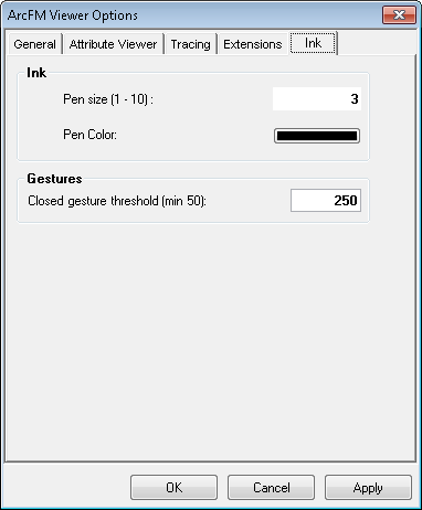 Use the Ink tab to set various options for the Digital Ink and Gesture tools. These tools allow you to use a stylus on a tablet PC to draw graphics and navigate the map display.