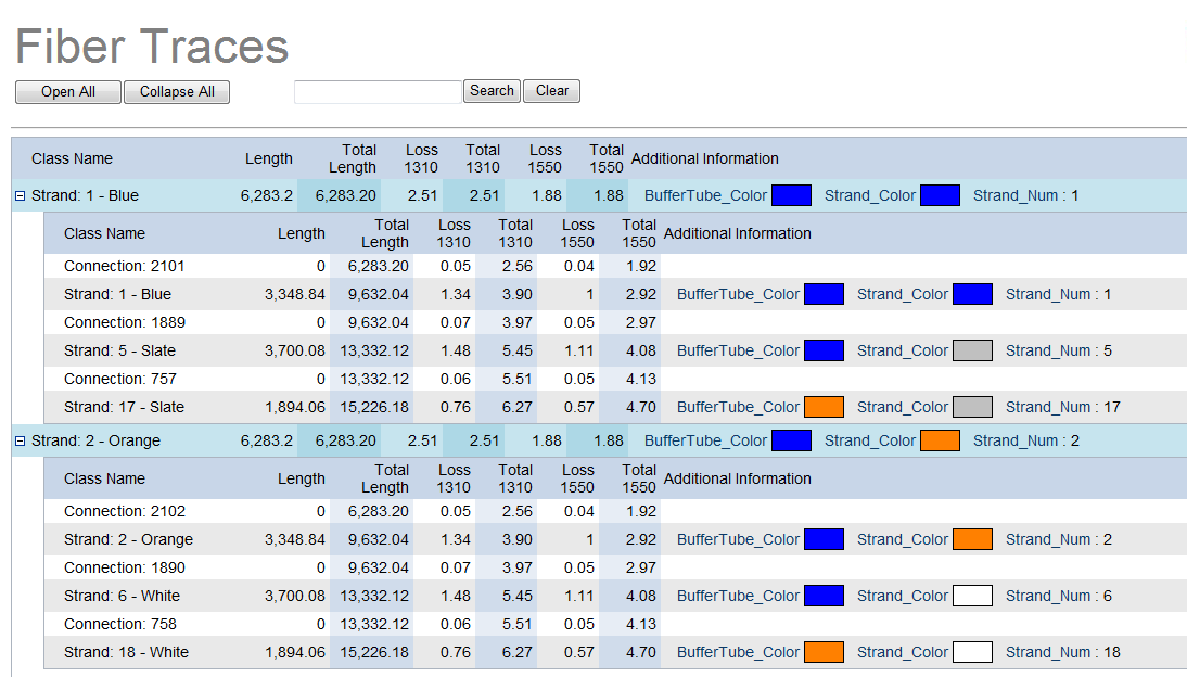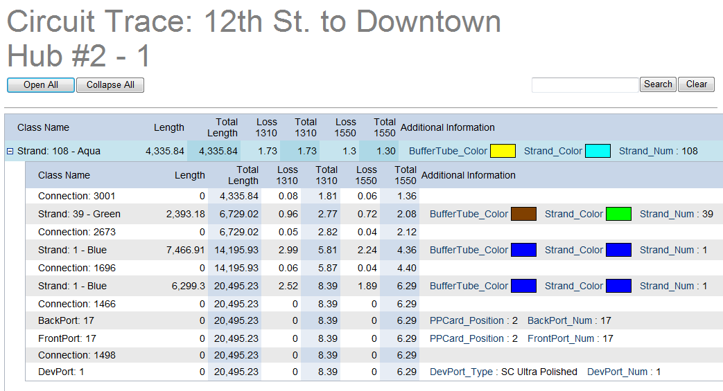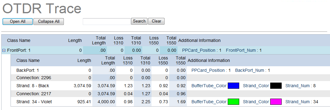 The Fiber Trace report displays the results of a Fiber Trace, OTDR Trace, or Circuit Trace within a web browser. The format of the report varies according to trace type.