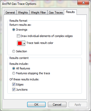 Results Content: Use the Results Content field to indicate the features that should be included in the trace. The ArcFM Gas Valve Isolation trace ignores this setting.