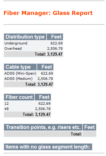 Use the glass report to summarize characteristics of fiber optic cables in the fiber optic system network. The report includes information on the total distance (in map units) of underground and overhead fiber optic cables, total distance (in map units) of various cable types, the total distance (in map units) of cables by fiber count, and a total length of glass in transition points. The report will also include a list of items that exist in the network but have no value in the glass segment length field.