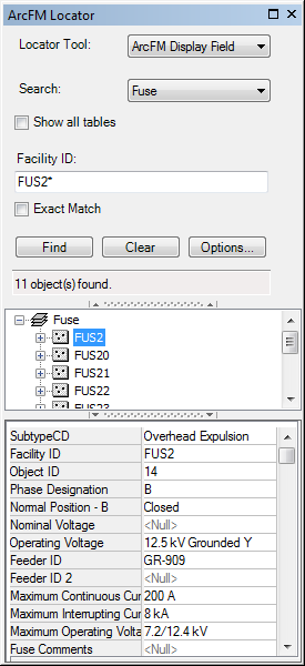 Stop: Each time you begin a search by clicking Find, the middle button on the user interface becomes Stop. Click Stop to cancel the search before it is finished. When the search is complete (or cancelled), the middle button reverts to Clear, which empties the results displayed in the bottom portion of the Locator tool's user interface as well as any search criteria. The Locator tool has two bars that allow you to expand or contract information in the window. The arrows on the bar indicate the direction it will go. When it's in the middle of the tab and the arrows point down, it will move down and hide the contents below or reveal hidden contents above. When the arrows point up, it will move up to reveal hidden contents or hide displayed contents. In the example at the right, the top bar would move up to hide the Locator form. The bottom bar would move down to hide the object viewer. Following is a list of the locators provided with the installation of ArcFM Viewer for ArcGIS Engine. |
