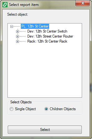 Fiber Manager works with both the ArcFM Solutions classic data model and the flexible data model. If you are working with the classic data model, the Patch Panels window will appear. If you are working with the flexible data model, the Select report item window will appear. |