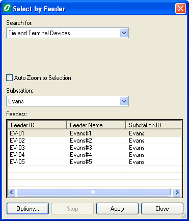 The Feeder/Tie locator allows you to locate all tie and/or terminal devices and filter the found set into those devices associated with a given feeder or group of feeders.