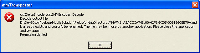 This error may indicate that the workspace has not been released by another application. Close any open applications and execute Send/Receive Mobile Data again.