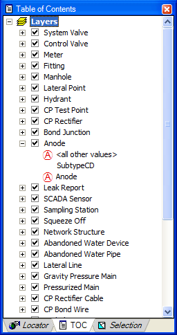 The Table of Contents tab contains entries for the data that is used in the map. Unselect a checkbox next to a feature class to make it invisible in the map display. Hold down the Ctrl key while clicking a checkbox to select or unselect ALL checkboxes in the list.