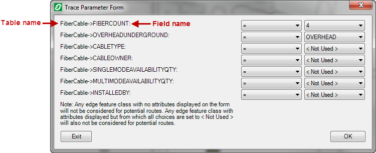 - Any edge feature class with no attributes displayed on the Trace Parameter Form will not be considered for potential routes by the trace.