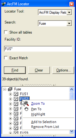 ArcFM utility tools let you navigate large map documents quickly by finding, highlighting, and moving features to the Selection tab. Access ArcFM utility tools by right-clicking a feature in a tree on many of the ArcFM Viewer tabs (e.g., Selection, ArcFM Locator, Identify tool, etc.) and selecting an option. Utility tools shown in blue are the default action. The default is the first option and the action that occurs when you double-click the feature.