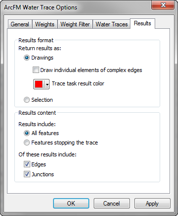 Results Format: Select the format in which you'd like the results to be displayed. This option may also be set using the Results as Selection toggle button on the ArcFM Water Traces toolbar. You may change this option after the trace has been executed. If you switch from Drawings to Selection, the current trace results will be converted to a selected set when you click OK. If you switch from Selection to Drawings, the current trace results will NOT be converted to graphics.