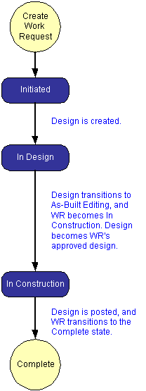 The Work Request Process Flow begins when a user (usually an Account Rep) creates a work request. Once created, the work request is advanced through the workflow by the Design Process Flow. Work Request Flow for DesignerWhen a Designer creates a design, the work request enters the In Design state (or status). The work request remains In Design while the design is edited and submitted for approval. When the design is approved, the work request remains In Design. Once a design is approved, construction crews begin installing the designated facilities in the field. Discrepancies between the design and the work performed in the field are added to the design while in the As-Built Editing state. The work request becomes In Construction while the design goes through As-Built Editing. Next the design and work request are verified. The work request finishes its lifecycle as Complete, and the design is Verified. At any point in the work request's lifecycle, an Administrator may choose to delete a design or a work request and its related designs. Work Request Flow for Designer ExpressWhen a Designer creates an express design, the work request enters the In Design state (or status). Eventually, the user can send the express design to GIS. When the design is sent to GIS, the work request remains In Design. After an express design is sent to GIS, it can be opened for as-built editing. While the express design is opened for as-built editing, the work request remains In Design. When the design is approved, the work request remains In Design. Once an express design is approved, the construction crews begin installing the designated facilities in the field. Discrepancies between the express design and the work performed in the field are added to the express design while in the As-Built Editing state. The work request becomes In Construction while the design goes through As-Built Editing. Next the express design and work request are verified. The work request finishes its lifecycle as Complete, and the design is Verified. At any point in the work request's lifecycle, an Administrator may choose to delete a design or a work request and its related designs.