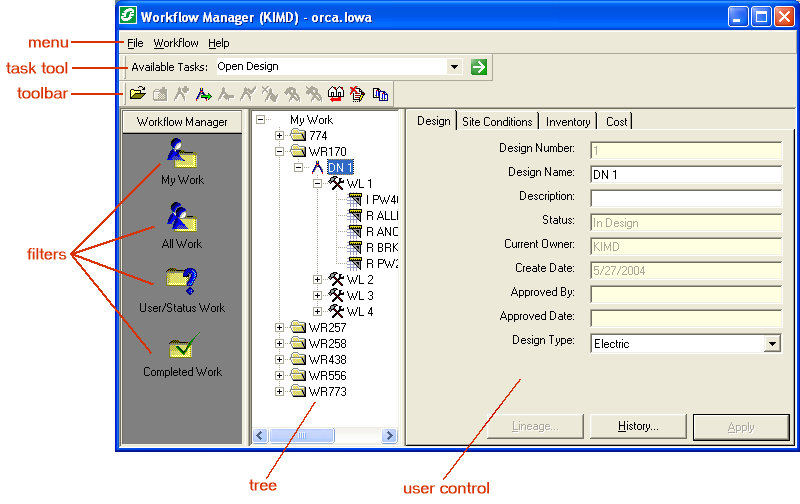 Tree: The tree shows the work requests and designs (based on the filter you have selected). Click the plus symbol to expand the selection. Select a work request or design in the tree to populate the user control with information about that node.