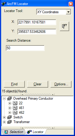 - Enter a search distance (in map units). Locator tool will find features within this distance of the XY coordinates entered or selected on the map.
