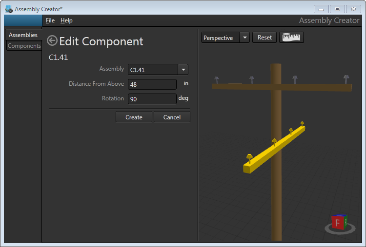 - For the first assembly, select the equipment from the Assembly drop-down list. This list is populated with assemblies currently in Assembly Creator that only have a cross arm (i.e., no pole top pins, neutral brackets, nor vertical brackets). Each time the value of the drop-down list is changed, the canvas updates the display to match the selection, highlighting the assembly in yellow.