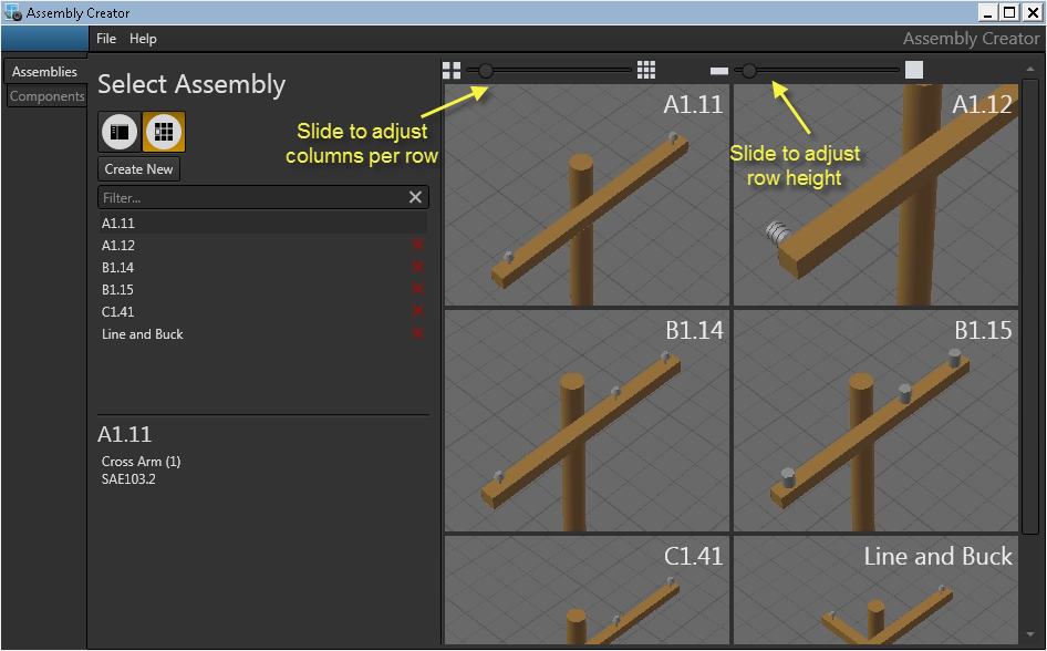 Displays all assemblies in a grid of tiles in the display window. Click an assembly in the list to highlight its tile. Double-click the assembly in the list or its tile to target it on the Assembly Information form.