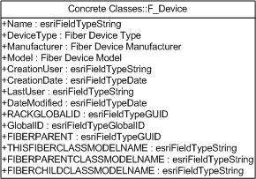 Attributes (required fields in red): Name: text - This is a unique name for the device at a specific location, DevicePoint or PatchLocation. This name needs to be unique in order for the Connection Manager to display the Device correctly. DeviceType: text - This field stores the classification of the type of equipment that is represented by this feature. These types can be as diverse as a multiplexer (Mux) or a router. Anything that can connect to the end of a fiber optic circuit can be a device. The Fiber Device Type domain is assigned to this field. Manufacturer: text - This is the manufacturer of the device. This may be useful for some organizations to store in their GIS. The Fiber Device Manufacturer domain is assigned to this field. Model: text - This is the model number of the device. This may be useful for some organizations to store in their GIS. It is not a required field, so it can be deleted if not needed. The model and manufacturer fields can also be concatenated together if the combination does not create too large of a domain. This will ensure that model numbers are not assigned to invalid manufacturers. The Fiber Device Model domain is assigned to this field. RackGlobalID: GUID - This field contains the GlobalID of the rack. GlobalID: GlobalID - This field contains a unique number (GUID) that is generated and maintained by ArcGIS. This value is used for all relationships in the ArcFM data model and is required for Fiber Manager to function properly. FiberParent: GUID - This field contains the GlobalID of the parent object to the current object. ThisFiberClassModelName: text - This field stores the class model name assigned to the feature class on which the field resides. It is used in conjunction with the FiberParentClassModelName field to determine the GlobalID that will be placed in the FiberParent field. FiberParentClassModelName: text - This field stores the class model name assigned to the feature class that is the parent of the class on which the field resides. It is used in conjunction with the ThisFiberClassModelName field to determine the GlobalID that will be placed in the FiberParent field. FiberChildClassModelName: text - This field stores the class model name of a child object to the object on which the field resides.