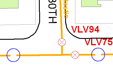To abandon a pipe feature, you must first separate it from the network. To do this, cut linear feature classes and trim back by the trim distance, which is assigned in the ArcFM Abandon Tool Options dialog. If you cut and trim a piece of pipe, any features connected to the cut section will also be abandoned. In Figure 1, the pipe was cut in the two places indicated with blue circles. The line that runs perpendicular to the cut pipe and the two valves would be abandoned as well. Any features connected to this pipe would also be abandoned, potentially a large portion of the network.