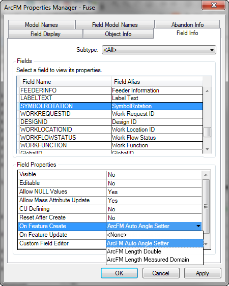 In the dropdown select the field to which the ArcFM Auto Angle Setter autoupdater is assigned (e.g., SymbolRotation).