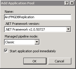 - Enter an Application Pool ID. You can enter any value you’d like. The example uses ArcFMGDBReplication. Select the appropriate .NET Framework version and select the Classic Managed pipeline mode. Click OK to finish.