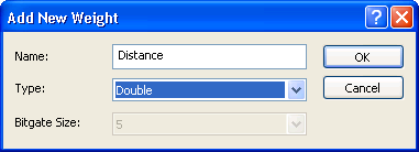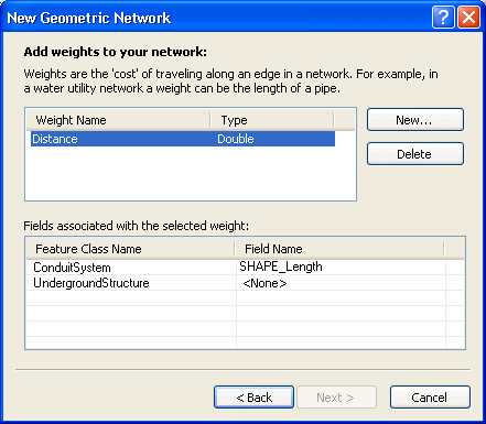 - Enter Distance as the weight name and select either the single or double data type. For more information about the Distance weight, please refer to the Weights topic. Assign the Distance weight to the shape length field of the Conduit System feature class.