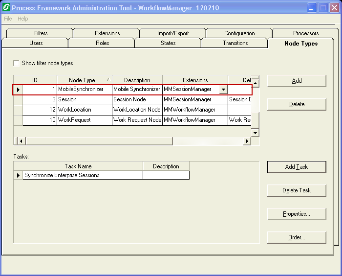 1. Open the Process Framework Administration tool for the database (e.g., SessionManager.mdb, WorkflowManager.mdb, FieldSessionManager.mdb). Select the Node Types tab.
