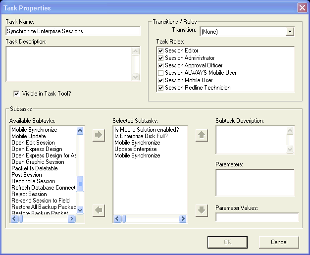 4. Enter a name in the Task Name field. This may be any name you choose. Assign roles as appropriate. The Mobile Synchronizer requires a login to the Process Framework database, so the login user should have permissions to execute this task.