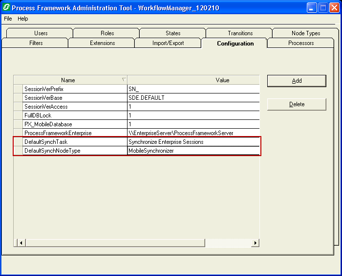 11. Add a row with a Name value of DefaultSynchNodeType. In the Name field, enter the name of the node type created in step 2.