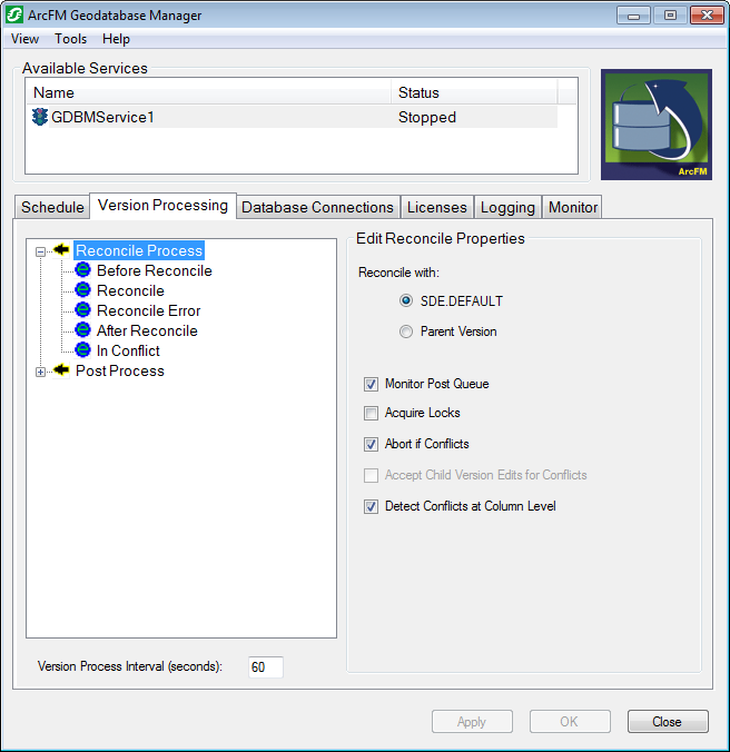 - Monitor Post Queue: This setting determines whether Geodatabase Manager should look at the post queue for versions waiting to be posted between version reconciles. This setting applies only if you are running Reconcile and Post services and the same time. The Post service will run first, followed by the Reconcile. If any versions enter the Post queue during the Reconcile service and this option is selected, the versions will be posted between reconciled versions. Select the checkbox to monitor the post queue.