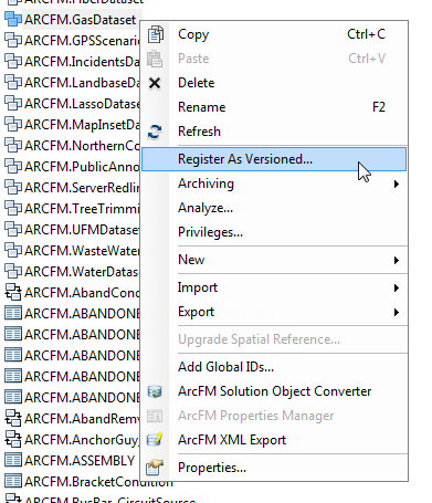 If your gas or water dataset is already registered as versioned, you must reregister your that dataset as versioned, which will also register the table you just created. Right-click the dataset and select Register As Versioned:
