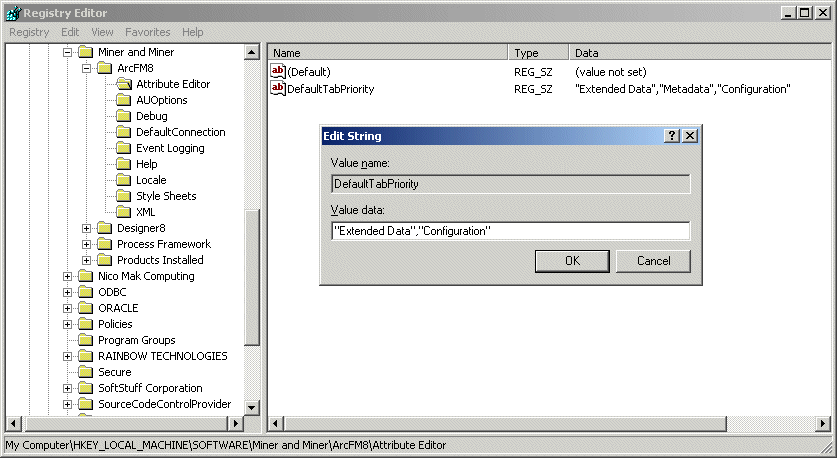 Open the Registry and browse to: HKEY_LOCAL_MACHINE\SOFTWARE\Wow6432Node\Miner and Miner\ArcFM8\Attribute Editor. Double-click DefaultTabPriority. The Value Data field accepts string values.
