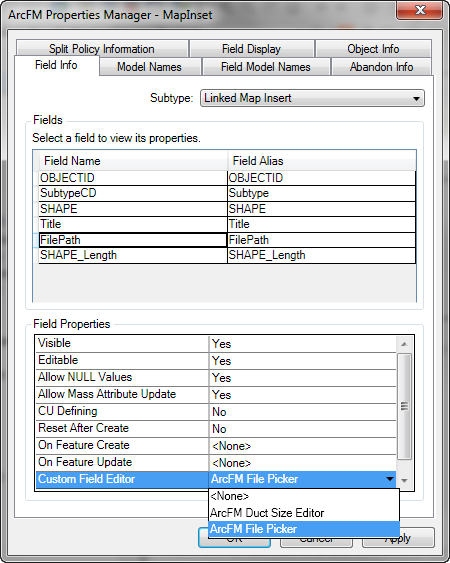 13. In the Custom Field Editor field, select ArcFM File Picker.