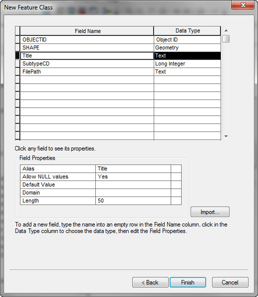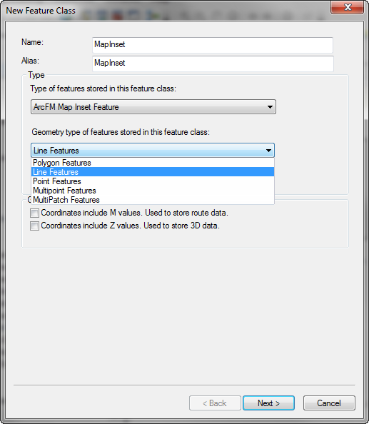 To configure the Map Inset feature class for use in ArcMap, first create a map inset feature class with the following fields and data types. When you select the ArcFM Map Inset feature (custom object), the fields, data types and subtypes are created automatically. Click Finish.