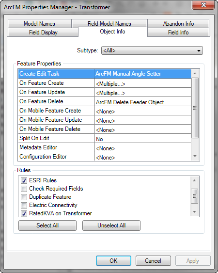 Assign this field validation rule to the PhaseDesignation attribute of the TransformerUnit object class. On the Field Info tab, select Phase of Bank Unit from the Validation Rules field for the PhaseDesignation attribute.