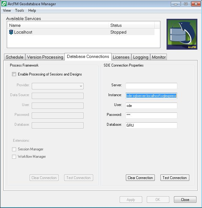 The Database Connections tab allows you to set connections to your Process Framework and SDE databases. These are the databases Geodatabase Manager uses to post and reconcile versions.