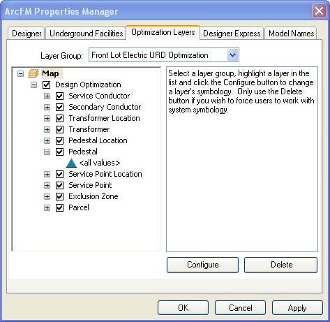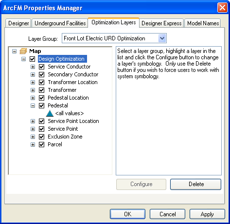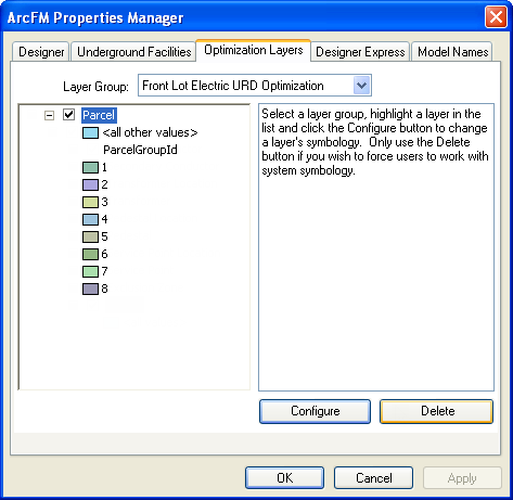 Right-click a geodatabase in ArcCatalog and select ArcFM Properties Manager. Click the Optimization Layers tab. This tab allows you to select the layer group and configure the selected layer group's symbology using the options available on this tab. Currently the Front Lot Electric URD Optimization is the only option in the Layer Group field.