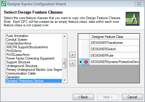Design feature classes can be added ONLY with the wizard. DFCs created in any other manner will not work properly with Designer Express. |