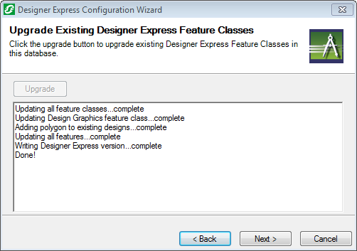 If you do not upgrade you may not be able to open express designs or use the Cost Item Library Manager. If you are only upgrading, click Cancel. You have finished the process. If you want to create a new design feature class dataset, continue through the rest of the steps. |