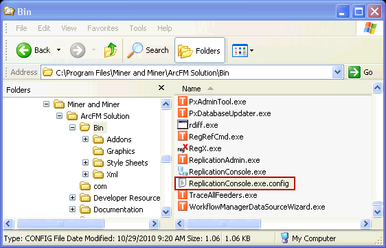 3. Copy the ReplicationConsole.exe.config file from the shared network directory to the Miner and Miner\ArcFM Solution\bin directory on the client machine you're configuring. If the file already exists at this location, you may overwrite it.