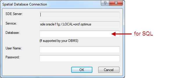 | Database (EZConnect Name) | Oracle: This field defines the Oracle connection. Type in the EZConnect name of the database. EZConnection names are case-sensitive. For more information, please see the Oracle documentation. SQL: This field is not needed for an SQL connection. (It defines the Oracle connection.) |