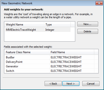 Network weights are what make tracing tasks work. Weights are assigned during the process of building the geometric network. (For more information, see ArcGIS Help, Creating a New Geometric Network.) These steps assume that you have created features that you want to participate in tracing tasks with a field that will be assigned model name MMELECTRICTRACEWEIGHT to which is assigned the MMElectricTraceWeight (exact spelling and capitalization) weight. Check for build errors after the wizard is finished.