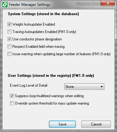 Tracing Autoupdater Enabled (FM1.0 only): Disable to increase performance or to temporarily turn off for maintenance purposes. If edits are made to the data, trace feeders will have to be performed on all affected feeders to ensure data validity. Disabling this function while initializing electic trace weights will increase performance. This setting is stored in the MM_SYSTEM_PERSIST_INFO table under the name of the geometric network.