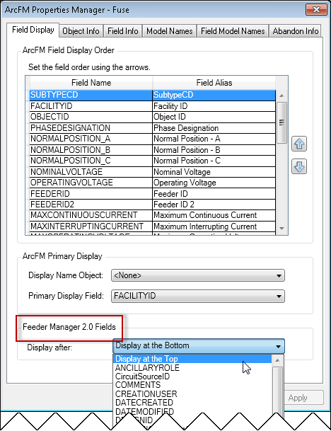 By design, Feeder Manager (FM) 2.0 fields do not exist on feature classes so you cannot individually order them in the same way as feature class fields. You can, however, determine where the group of FM 2.0 fields (including custom fields) appear in the list of an electric geometric network feature's attributes. This is useful, for example, if you want these fields at the top of the attribute list so they are readily available without having to scroll through a long list of fields.