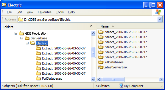 Each extracted geodatabase is stored in a separate folder in the Base Path directory (e.g., ServerBase). The Server only stores the last update received before the current request. So, when the current request is filled, there are two versions of the SDE geodatabase in the Base Path: the most recent request and the last request before it.