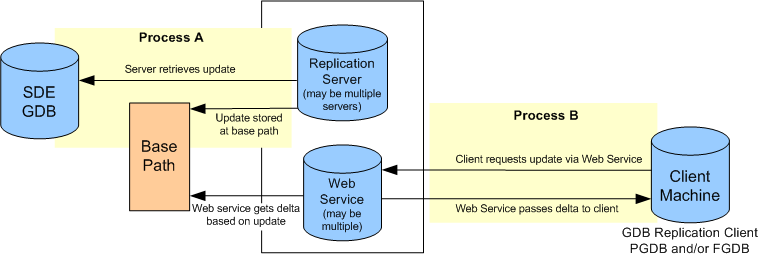 The image below depicts the Geodatabase Replication components and how they interact. The Replication Server and Web Service may reside on the same server or different servers. You may also have multiple replication servers retrieving data from a variety of SDE geodatabases and multiple web services providing the client with delta files.
